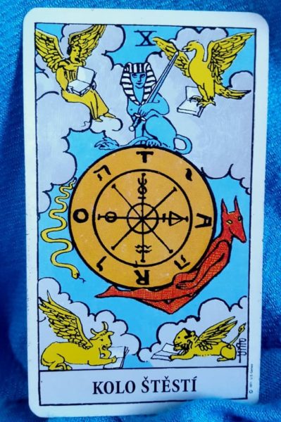 - Koukám na kartu ze sady Rider-Waite a vnímám z ní především rotaci, pohyb…rozhodně to není nic stagnačního. Do vínku mi tedy byl dán dar neustále začínat znovu, schopnost zvedat se po radikálních pádech, často také jít „ode zdi ke zdi“, to znamená prožívat extrémy a zkoušet nové věci. Ano, je to tak, stagnace mě přímo děsí! Angeles Arrien z knihy “Velká kniha Crowleyho tarotu” dále o zrozencích v Kole štěstí píše: “Tyto osoby přitahuje vše neotřelé a originální. Je pro ně nanejvýš inspirující, když se mohou pustit do něčeho, co nikdo před nimi ještě nezkusil. Jejich hlavním rysem je touha objevovat nové světy, neboť jsou rozenými průkopníky a futuristy. Jako by měli šestý smysl, který okamžitě rozpozná příležitost. ” Tak v tom se naprosto poznávám… Jo. A taky jsem “nedělňátko” …stejně jako Rozárka. Jde přeci o Kolo ŠTĚSTÍ. Musím říct, že velké štěstí mě skutečně provází celý život, za což moc děkuji!!!